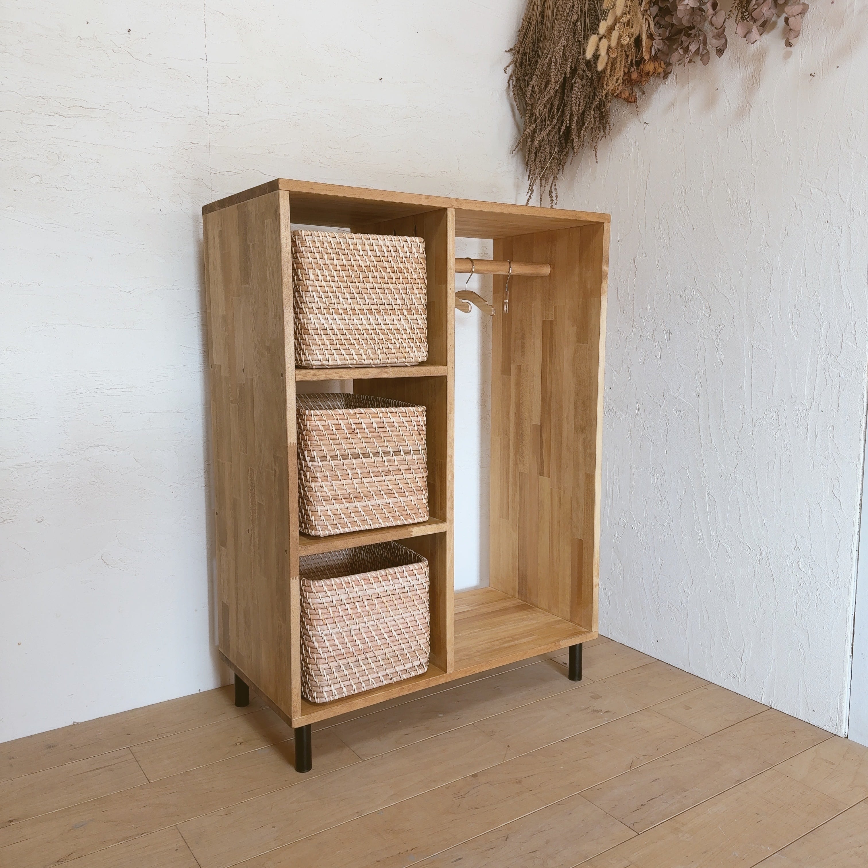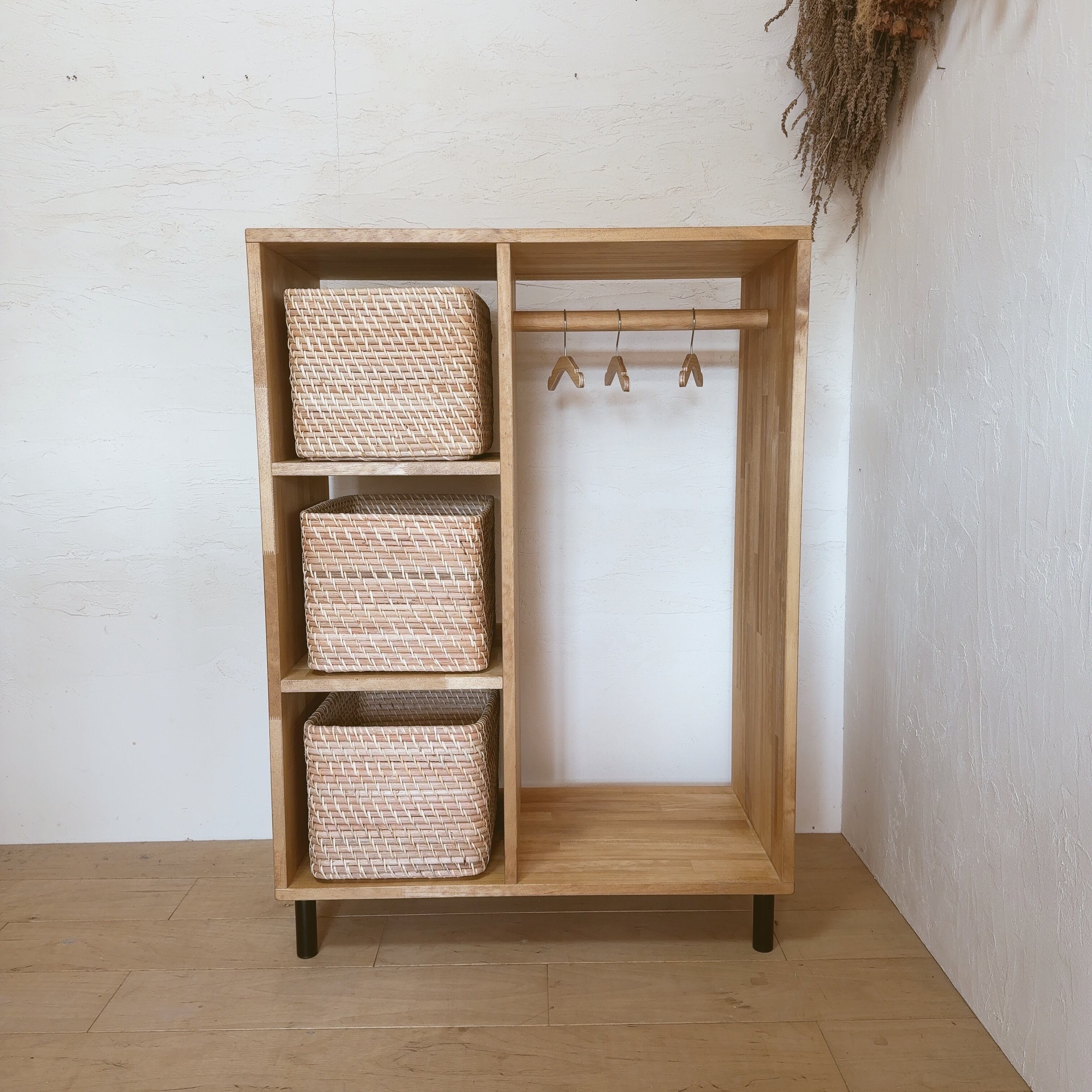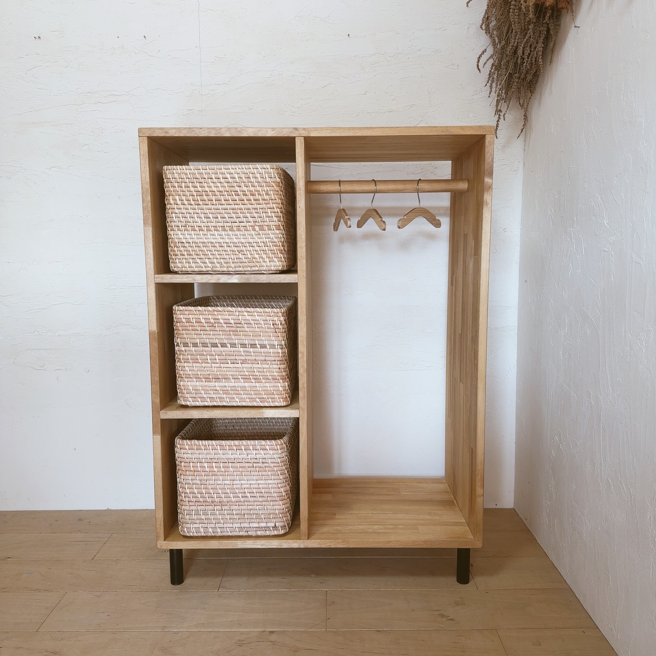 左側は棚収納になっており、ランドセルや教科書、習い事のバッグなどを収納できます。バスケットを入れれば、小物や文房具の整理にも便利です。